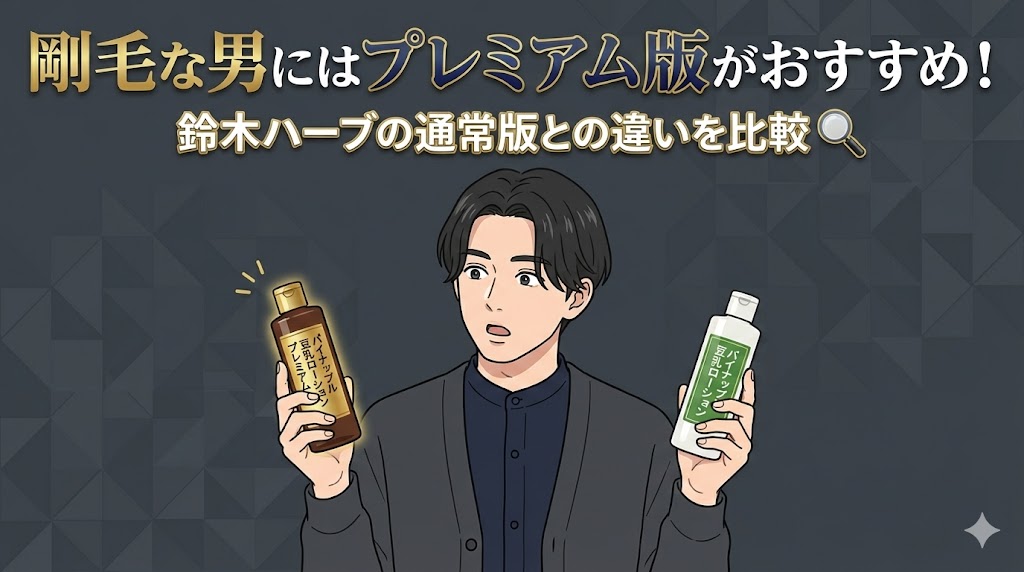 鈴木ハーブ研究所のパイナップル豆乳ローションプレミアムは、通常版より4倍濃い成分で、剛毛な男性の悩みに真っ向から応えてくれる1本です。